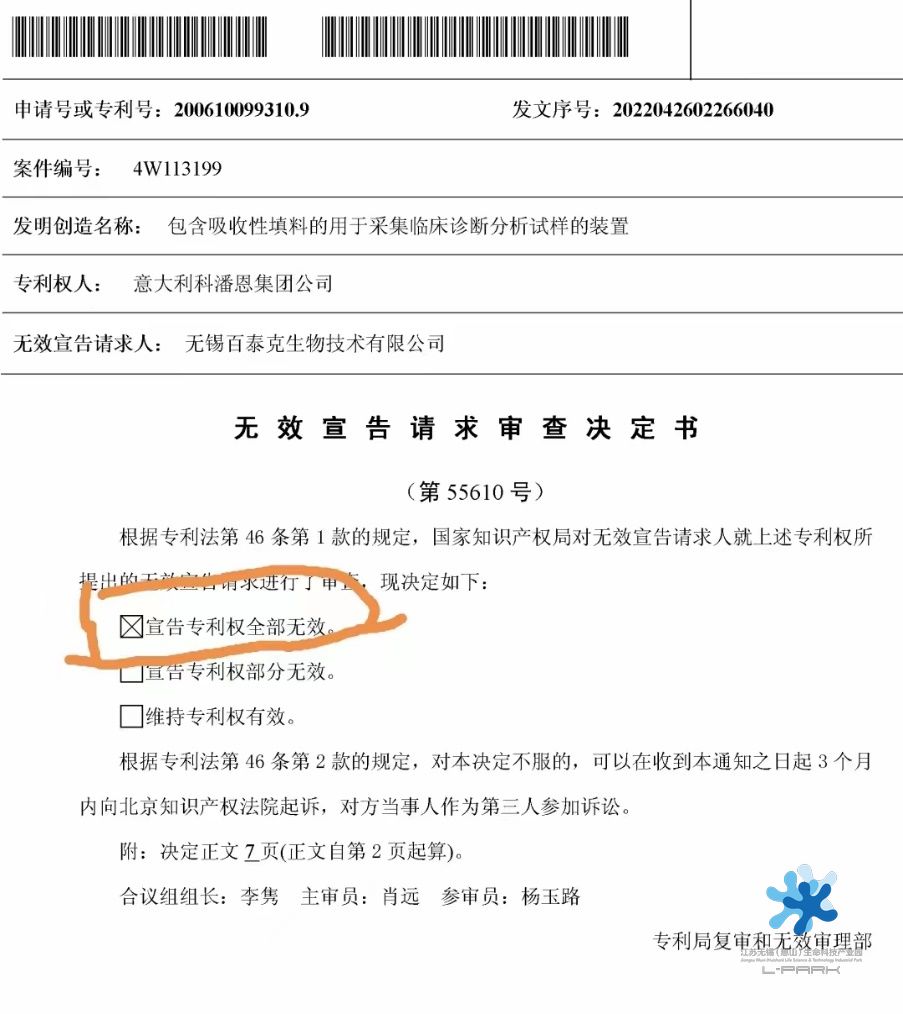 Copan中國專利無效宣告請求審查決定書